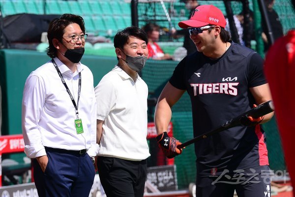 3일 인천 SSG 랜더스필드에서 ‘2022 신한은행 SOL KBO리그’ SSG 랜더스와 KIA 타이거즈의 경기가 열린다. 경기 전 KIA 나성범이 김선우 해설위원과 이야기를 나누고 있다.
