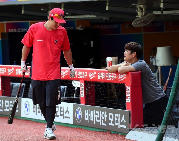 3일 인천 SSG 랜더스필드에서 ‘2022 신한은행 SOL KBO리그’ SSG 랜더스와 KIA 타이거즈의 경기가 열린다. 경기 전 KIA 박동원과 SSG 김민식이 이야기를 나누고 있다.