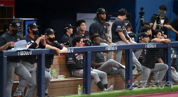 3일 서울 고척스카이돔에서 ‘2022 신한은행 MY CAR KBO리그’ 한화이글스와 키움 히어로즈 경기가 열렸다. 1-2로 패하며 4연패에 빠진 한화 선수들이 9회초 공격을 바라보고 있다.