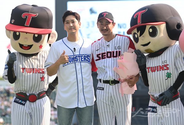 3일 서울 잠실야구장에서 열린 ‘2022 신한은행 SOL KBO리그’ LG 트윈스와 롯데 자이언츠의 경기에 앞서 박용택이 은퇴식에서 심수창으로부터 꽃다발을 받은 후 기념 촬영을 하고 있다.
