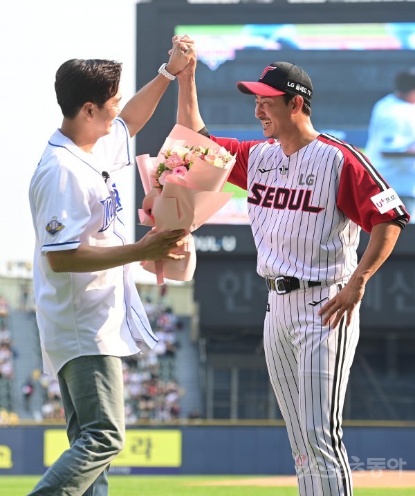 3일 서울 잠실야구장에서 열린 ‘2022 신한은행 SOL KBO리그’ LG 트윈스와 롯데 자이언츠의 경기에 앞서 박용택이 은퇴식에서 심수창과 손을 맞잡고 있다.