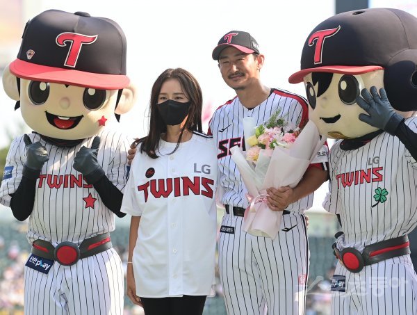 3일 서울 잠실야구장에서 열린 ‘2022 신한은행 SOL KBO리그’ LG 트윈스와 롯데 자이언츠의 경기에 앞서 박용택이 아내 한진영으로부터 꽃다발을 받은 후 기념 촬영을 하고 있다.