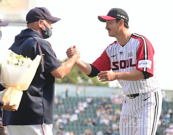3일 서울 잠실야구장에서 열린 ‘2022 신한은행 SOL KBO리그’ LG 트윈스와 롯데 자이언츠의 경기에 앞서 박용택이 은퇴식에서 롯데 서튼 감독과 인사하고 있다.