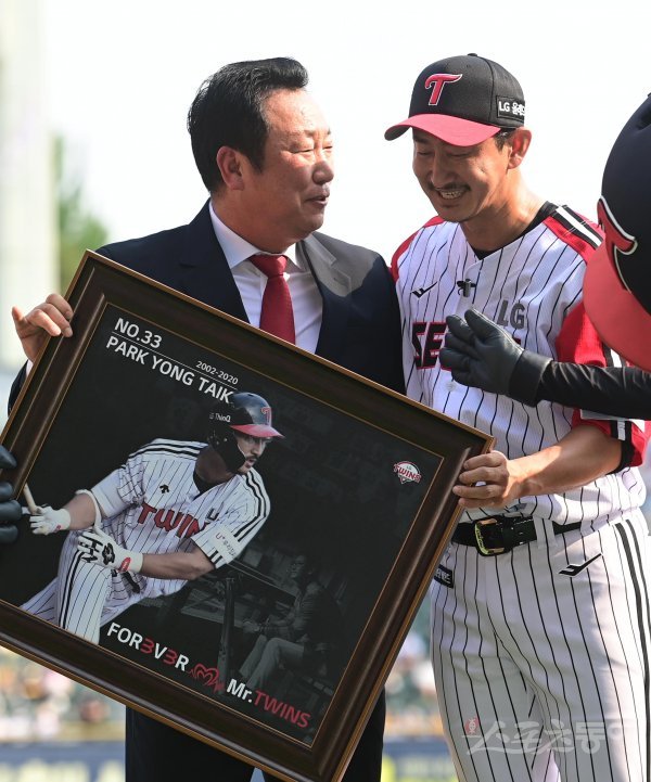 3일 서울 잠실야구장에서 열린 ‘2022 신한은행 SOL KBO리그’ LG 트윈스와 롯데 자이언츠의 경기에 앞서 박용택이 은퇴식에서 차명석 단장으로부터 기념 액자를 받은 후 이야기를 하고 있다.