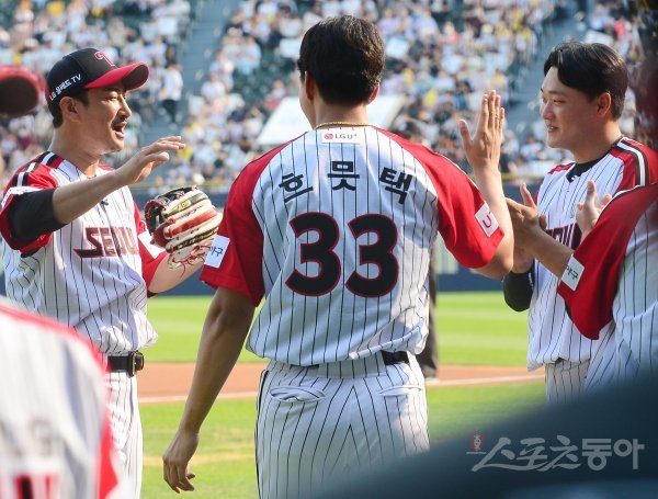 3일 서울 잠실야구장에서 열린 ‘2022 신한은행 SOL KBO리그’ LG 트윈스와 롯데 자이언츠의 경기에 앞서 박용택이 특별 라인업에서 교체되며 LG 선수들과 인사하고 있다.