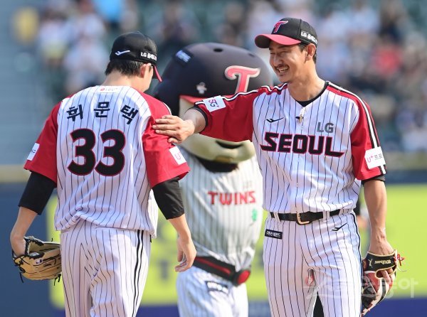 3일 서울 잠실야구장에서 열린 ‘2022 신한은행 SOL KBO리그’ LG 트윈스와 롯데 자이언츠의 경기에 앞서 박용택이 은퇴 기념 시구 전 임찬규와 인사하고 있다.