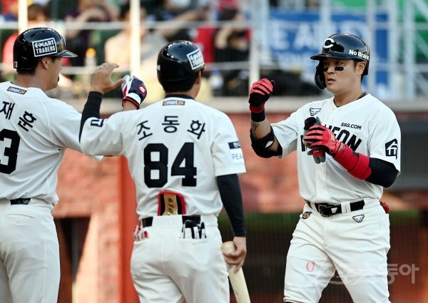 3일 인천 SSG 랜더스필드에서 ‘2022 신한은행 SOL KBO리그’ SSG 랜더스와 KIA 타이거즈의 경기가 열렸다. 3회말 1사 1루에서 SSG 추신수가 투런 홈런을 쏘아 올린 후 동료들의 환영을 받고 있다.