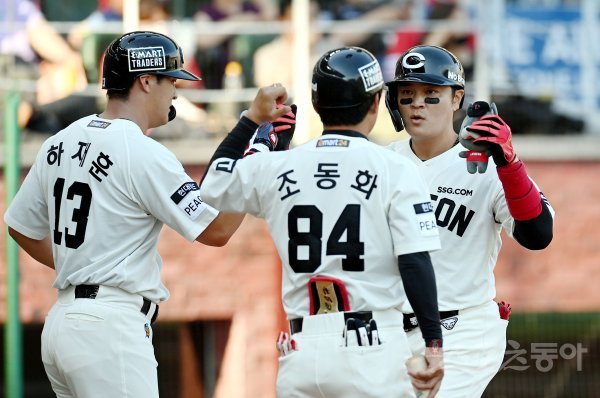 3일 인천 SSG 랜더스필드에서 ‘2022 신한은행 SOL KBO리그’ SSG 랜더스와 KIA 타이거즈의 경기가 열렸다. 3회말 1사 1루에서 SSG 추신수가 투런 홈런을 쏘아 올린 후 동료들의 환영을 받고 있다.