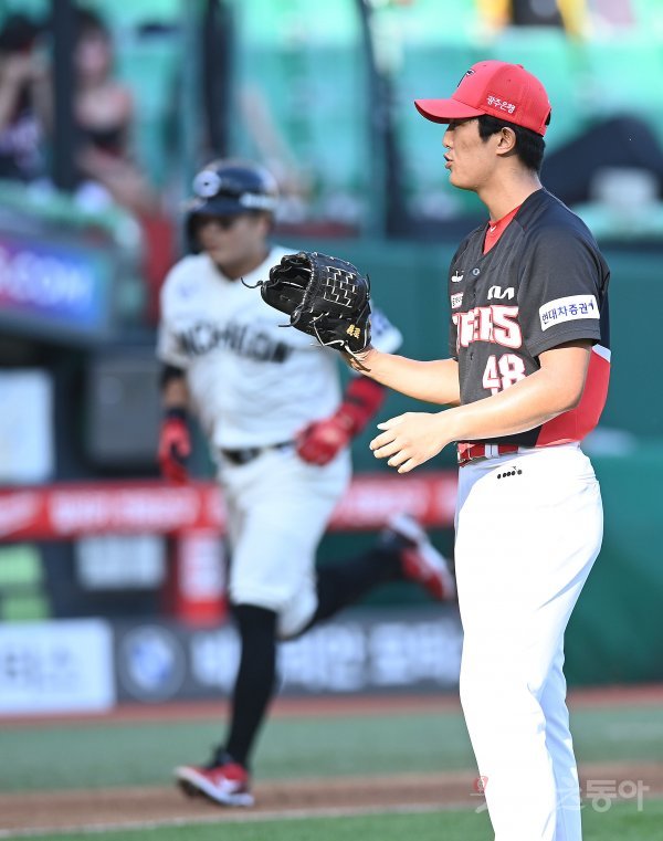3일 인천 SSG 랜더스필드에서 ‘2022 신한은행 SOL KBO리그’ SSG 랜더스와 KIA 타이거즈의 경기가 열렸다. 3회말 1사 1루에서 KIA 선발 이의리가 홈런을 허용한 후 아쉬워하고 있다.