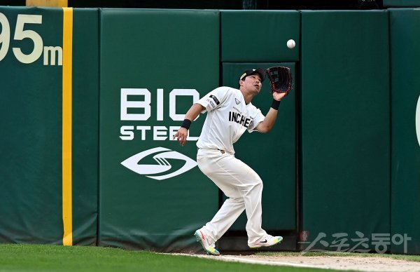 3일 인천 SSG 랜더스필드에서 ‘2022 신한은행 SOL KBO리그’ SSG 랜더스와 KIA 타이거즈의 경기가 열렸다. 8회초 무사에서 SSG 한유섬이 플라이 타구를 잡아내고 있다.