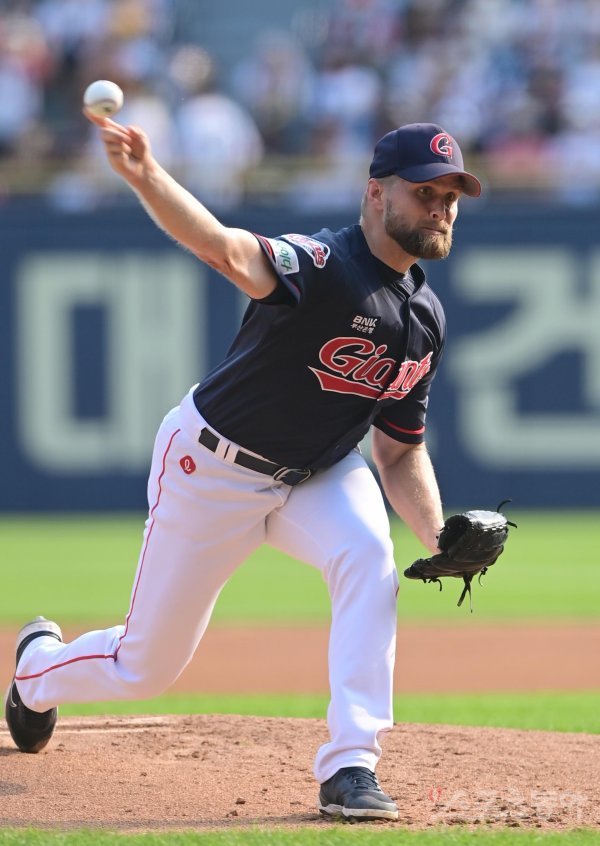 3일 서울 잠실야구장에서 열린 ‘2022 신한은행 SOL KBO리그’ LG 트윈스와 롯데 자이언츠의 경기에서 선발 투수로 마운드에 오른 롯데 스파크맨이 역투하고 있다.