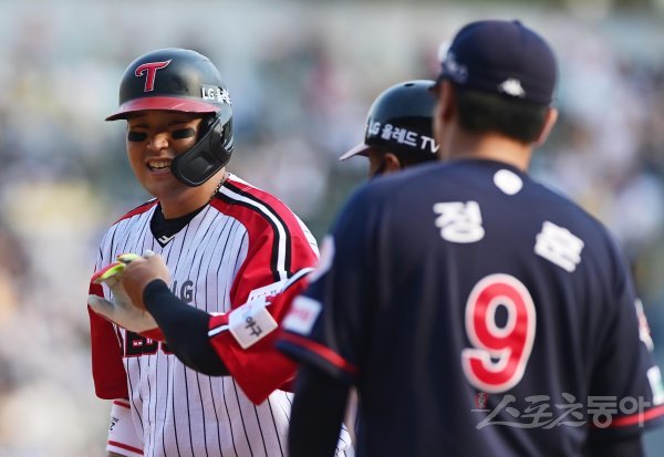 3일 서울 잠실야구장에서 열린 ‘2022 신한은행 SOL KBO리그’ LG 트윈스와 롯데 자이언츠의 경기에서 2회말 2사 3루 LG 유강남이 선제 1타점 중전 적시타를 쳐낸 후 3루코치의 축하를 받고 있다.