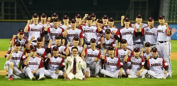 3일 서울 잠실야구장에서 열린 ‘2022 신한은행 SOL KBO리그’ LG 트윈스와 롯데 자이언츠의 경기 종료 후 영구결번식에서 박용택이 동료들과 기념 촬영을 하고 있다.