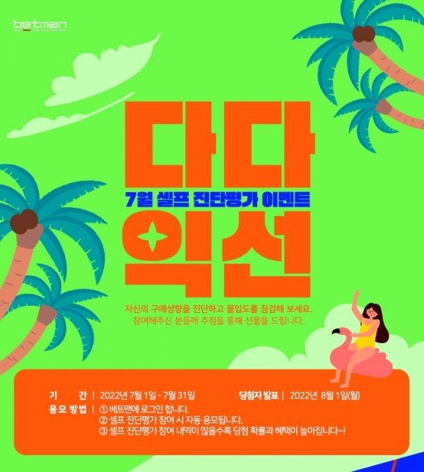 국민체육진흥공단에서 발행하는 체육진흥투표권 스포츠토토의 공식 온라인 발매 사이트 베트맨이 7월 셀프 진단평가 이벤트인 ‘다다익선!’을 1일(금)부터 31일(일)까지 한 달간 실시한다.스스로 건전구매 습관 만들 수 있는 프로그램 참여 가능