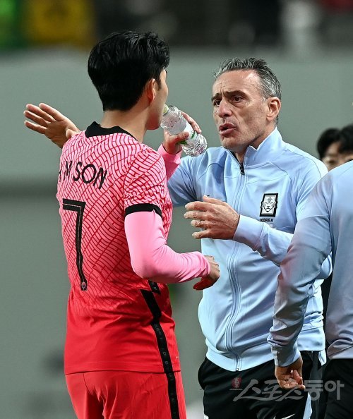 카타르월드컵을 앞둔 벤투호가 6월 A매치 4연전을 치르며 전력점검을 마쳤다. 그러나 김민재의 공백과 지나친 손흥민 의존증 등 과제를 남겼다. 사진은 벤투 감독과 손흥민. 스포츠동아DB