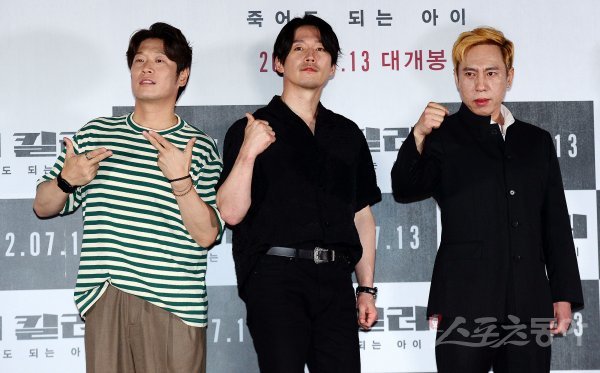 4일 오후 서울 용산CGV에서 열린 영화 ‘더 킬러:죽어도 되는 아이’ 기자 시사회에 참석한 최기섭, 장혁, 브루스 칸이 포즈를 취하고 있다. 영화 ‘더 킬러: 죽어도 되는 아이’는 호화로운 은퇴 생활을 즐기던 업계 최강 킬러 의강(장혁)이 겁도 없이 자신을 건드린 놈들을 끝까지 쫓아 응징하는 스트레이트 액션물이다.