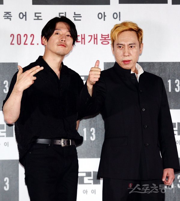 4일 오후 서울 용산CGV에서 열린 영화 ‘더 킬러:죽어도 되는 아이’ 기자 시사회에 참석한 장혁, 브루스 칸이 포즈를 취하고 있다. 영화 ‘더 킬러: 죽어도 되는 아이’는 호화로운 은퇴 생활을 즐기던 업계 최강 킬러 의강(장혁)이 겁도 없이 자신을 건드린 놈들을 끝까지 쫓아 응징하는 스트레이트 액션물이다.