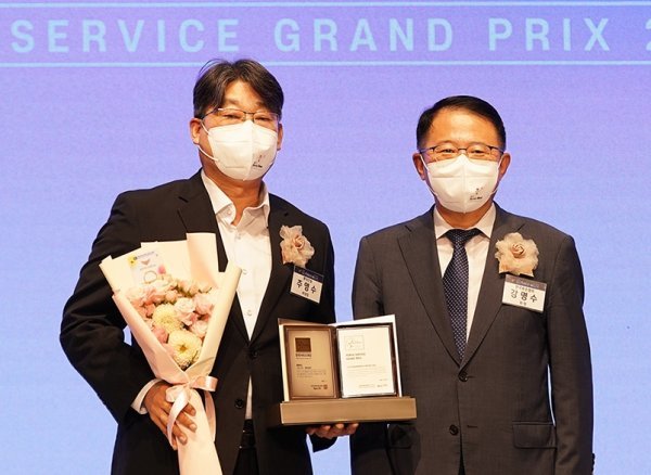 롯데건설 주영수 상무(왼쪽)가 ‘2022 한국서비스대상 시상식’에서 수상 후 기념촬영을 하고 있다. 사진제공|롯데건설