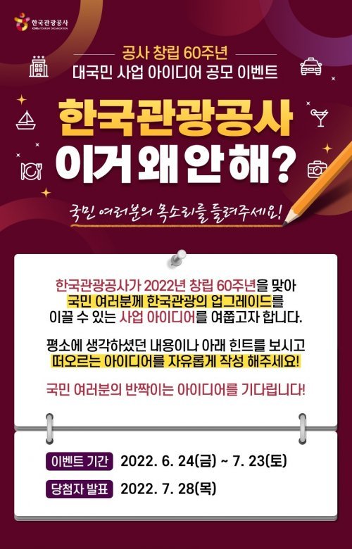 올해 창립 60주년을 맞은 한국관광공사는 신규 관광서비스 발굴을 위한 대국민 사업 아이디어 공모 이벤트를 23일까지 실시한다.