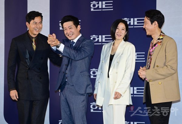 배우 정우성, 허성태, 전혜진, 감독 겸 배우 이정재가 5일 서울 성동구 성수동 메가박스 성수점에서 열린 영화 ‘헌트’ 제작보고회에서 포즈를 취하고 있다.