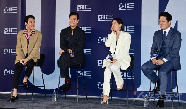 감독 겸 배우 이정재, 배우 정우성, 전혜진, 허성태가 5일 서울 성동구 성수동 메가박스 성수점에서 열린 영화 ‘헌트’ 제작보고회에서 답변을 마친 후 웃고 있다.