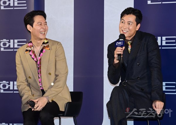 배우 정우성이 5일 서울 성동구 성수동 메가박스 성수점에서 열린 영화 ‘헌트’ 제작보고회에서 동료의 답변에 농담을 하고 있다.