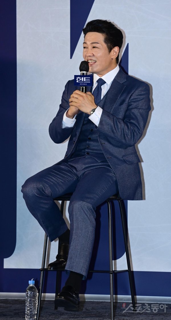 배우 허성태가 5일 서울 성동구 성수동 메가박스 성수점에서 열린 영화 ‘헌트’ 제작보고회에서 인사말을 하고 있다.