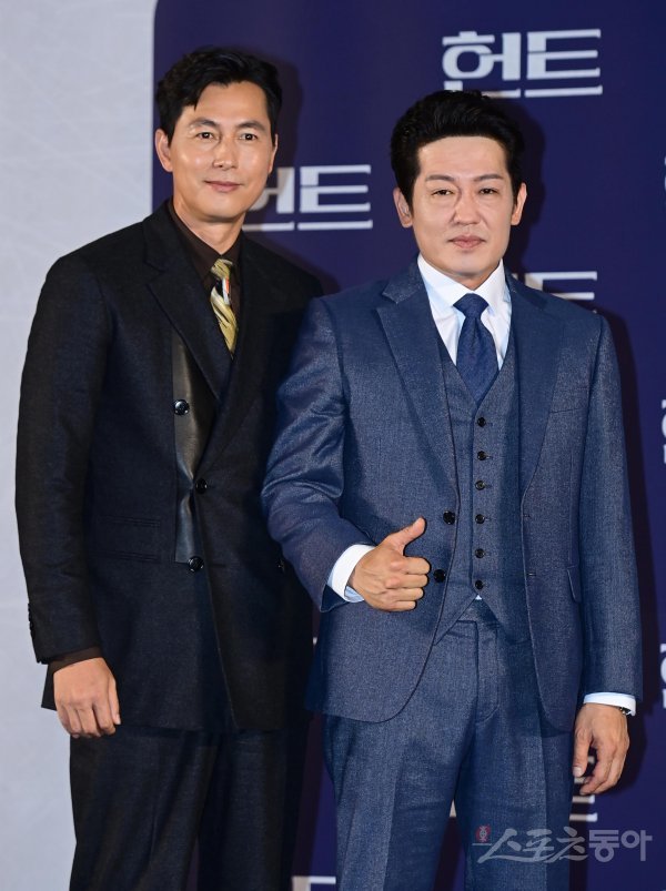 배우 정우성과 허성태가 5일 서울 성동구 성수동 메가박스 성수점에서 열린 영화 ‘헌트’ 제작보고회에서 포즈를 취하고 있다.
