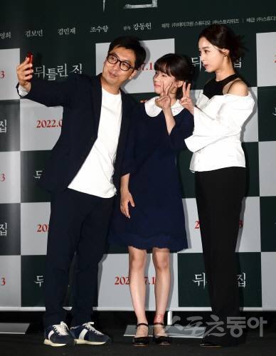 5일 서울 CGV용산에서 열린 영화 ‘뒤틀린 집’ 시사회에서 강동헌 감독, 배우 서영희, 김보민이 셀카를 찌고 있다.