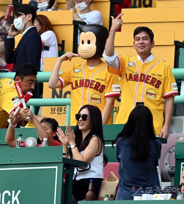 5일 인천 SSG 랜더스필드에서 ‘2022 신한은행 SOL KBO리그’ SSG 랜더스와 롯데 자이언츠의 경기가 열렸다. SSG 정용진 구단주가 관중석에서 팬들에게 인사하고 있다.