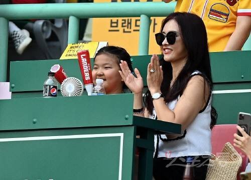 5일 인천 SSG 랜더스필드에서 ‘2022 신한은행 SOL KBO리그’ SSG 랜더스와 롯데 자이언츠의 경기가 열렸다. SSG 추신수 아내 하원미씨와 딸이 응원을 펼치고 있다.