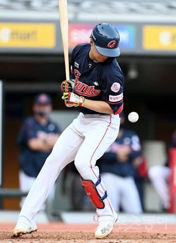 5일 인천 SSG 랜더스필드에서 ‘2022 신한은행 SOL KBO리그’ SSG 랜더스와 롯데 자이언츠의 경기가 열렸다. 3회초 무사에서 롯데 한태양이 투구에 맞고 있다.