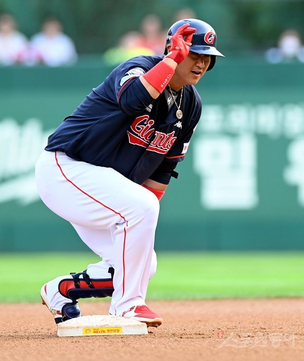 5일 인천 SSG 랜더스필드에서 ‘2022 신한은행 SOL KBO리그’ SSG 랜더스와 롯데 자이언츠의 경기가 열렸다. 1회초 1사 2루에서 롯데 이대호가 1타점 2루타를 날린 후 환호하고 있다.
