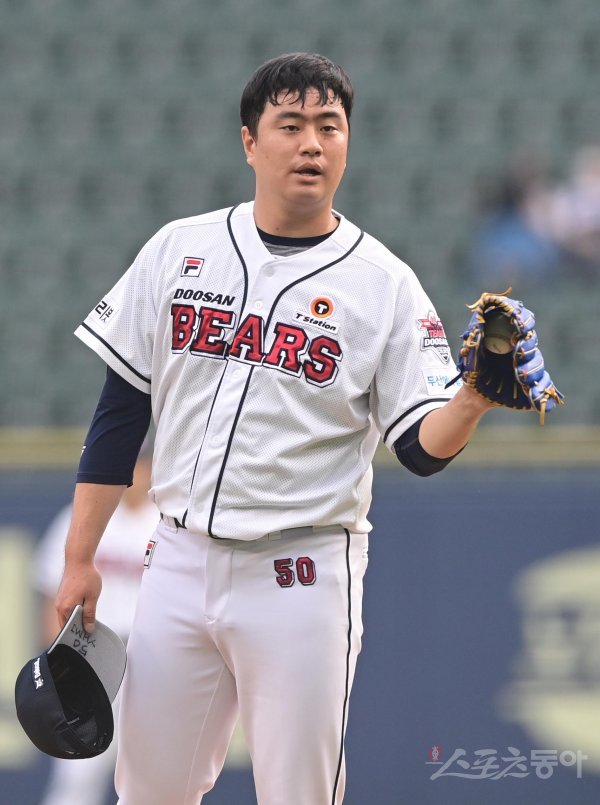 5일 서울 잠실야구장에서 열린 ‘2022 신한은행 SOL KBO리그’ 두산 베어스와 키움 히어로즈의 경기에서 1회초 2사 1루 키움에 볼넷을 허용한 두산 이영하가 아쉬워하고 있다.