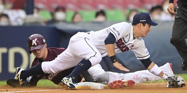 5일 서울 잠실야구장에서 열린 ‘2022 신한은행 SOL KBO리그’ 두산 베어스와 키움 히어로즈의 경기에서 4회초 1사 2루 키움의 내야 땅볼 때 두산 허경민이 3루로 파고든 2루주자 김혜성을 태그 아웃시키고 있다.