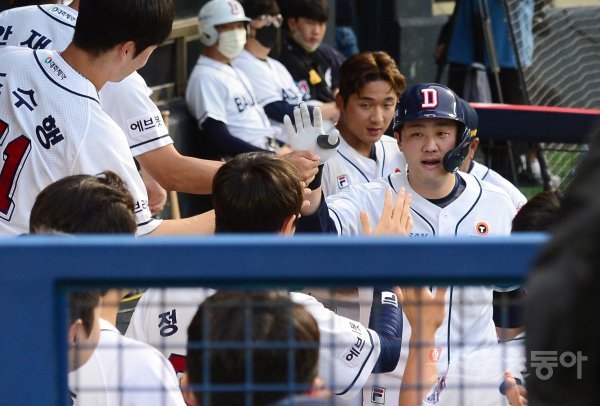 5일 서울 잠실야구장에서 열린 ‘2022 신한은행 SOL KBO리그’ 두산 베어스와 키움 히어로즈의 경기에서 4회말 무사 1루 두산 양석환이 선제 좌월 2점 홈런을 쳐낸 후 더그아웃에서 동료들의 축하를 받고 있다.