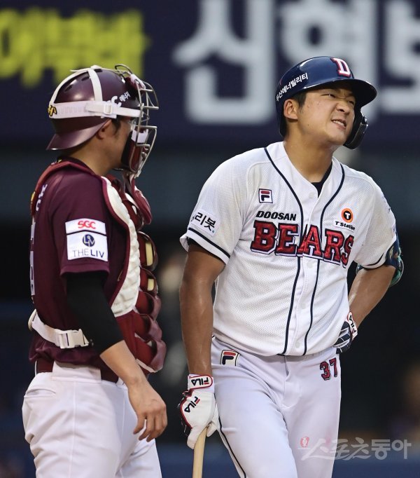 5일 서울 잠실야구장에서 열린 ‘2022 신한은행 SOL KBO리그’ 두산 베어스와 키움 히어로즈의 경기에서 4회말 무사 상황에서 키움 투수의 투구된 볼에 맞은 두산 김대한이 통증을 호소하고 있다.