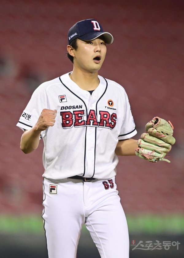 5일 서울 잠실야구장에서 열린 ‘2022 신한은행 SOL KBO리그’ 두산 베어스와 키움 히어로즈의 경기에서 6회초 2사 1, 2루 키움의 내야 땅볼에 두산 정철원이 주먹을 쥐며 기뻐하고 있다.