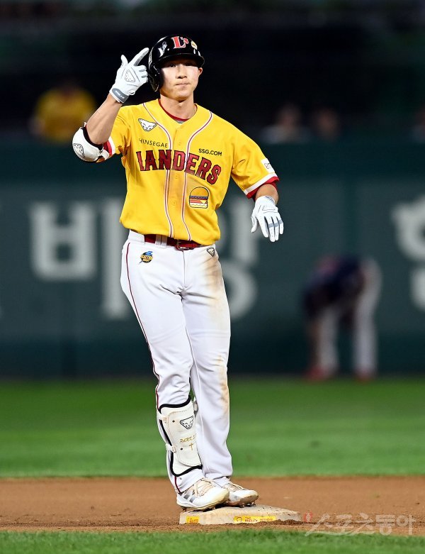 5일 인천 SSG 랜더스필드에서 ‘2022 신한은행 SOL KBO리그’ SSG 랜더스와 롯데 자이언츠의 경기가 열렸다. 8회말 2사에서 SSG 박성한이 2루타를 날린 후 세리머니를 펼치고 있다.