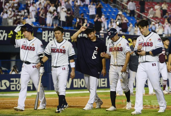 5일 서울 잠실야구장에서 열린 ‘2022 신한은행 SOL KBO리그’ 두산 베어스와 키움 히어로즈의 경기에서 키움에 3-4로 패한 두산 선수들이 아쉬워하고 있다.