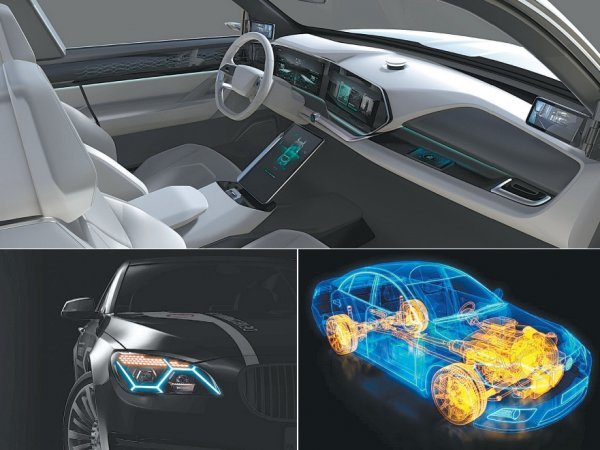 LG전자 인포테인먼트 시스템이 탑재된 디지털 콕핏, LG마그나 이파워트레인 전기차 파워트레인, ZKW 차세대 헤드램프의 콘셉트 이미지(위부터 시계방향). 사진제공|LG전자