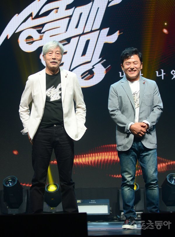 1980년대 가요계를 이끈 록 밴드 송골매가 40년 만에 뭉쳐 추석 연휴 기간 서울 송파구 올림픽공원 KSPO돔에서 ‘열망’(熱望)’ 전국 투어 콘서트를 개최한다. 6일 서울 마포구 신한play스퀘어에서 진행된 <2022 송골매 전구 투어 콘서트:‘열망’(熱望)’>제작발표회에서 배철수와 구창모가 포토타임을 갖고 있다.