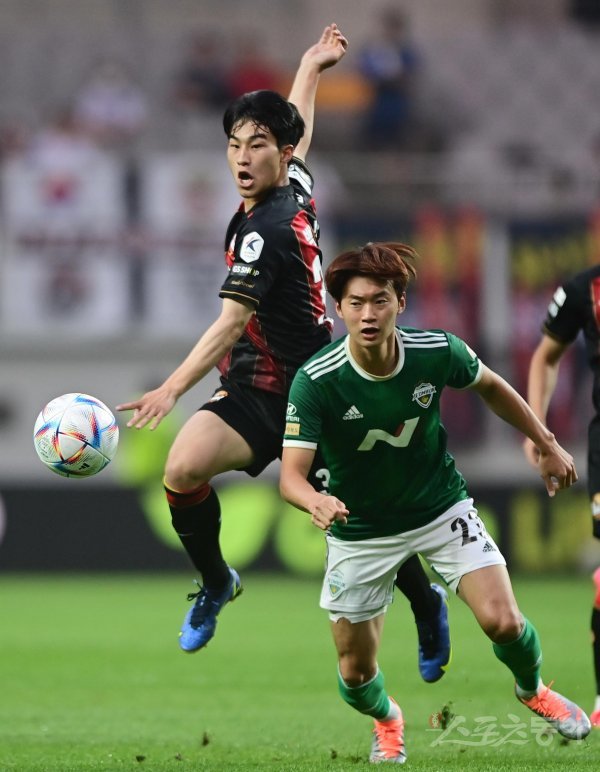 6일 서울월드컵경기장에서 열린 ‘하나원큐 K리그1 2022’ FC 서울과 전북 현대의 경기에서 전북 김진수와 서울 백상훈이 볼을 쫓으며 몸싸움을 하고 있다.