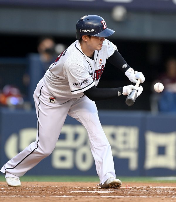 6일 서울 잠실야구장에서 ‘2022 신한은행 MY CAR KBO리그’ 키움 히어로즈와 두산 베어스 경기가 열렸다. 2회말 무사 1루 두산 김재호가 보내기번트를 성공시키고 있다.