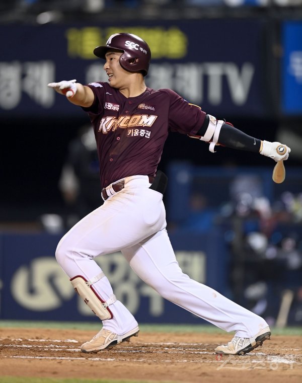 6일 서울 잠실야구장에서 ‘2022 신한은행 MY CAR KBO리그‘ 키움 히어로즈와 두산 베어스 경기가 열렸다. 6회초 2사 1,2루 키움 김휘집이 1타점 적시타를 치고 있다.