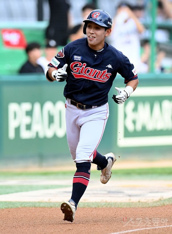 6일 인천 SSG 랜더스필드에서 ‘2022 신한은행 SOL KBO리그’ SSG 랜더스와 롯데 자이언츠의 경기가 열렸다. 1회초 무사에서 롯데 황성빈이 데뷔 첫 홈런을 쏘아 올린 후 그라운드를 돌고 있다.
