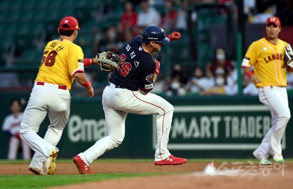 6일 인천 SSG 랜더스필드에서 ‘2022 신한은행 SOL KBO리그’ SSG 랜더스와 롯데 자이언츠의 경기가 열렸다. 5회초 2사 2루에서 롯데 피터스가 1타점 적시타를 날린 후 2루로 달리다 협살에 걸려 아웃되고 있다.