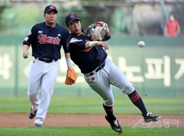 6일 인천 SSG 랜더스필드에서 ‘2022 신한은행 SOL KBO리그’ SSG 랜더스와 롯데 자이언츠의 경기가 열렸다. 1회말 1사에서 롯데 이호연이 내야땅볼 타구를 잡아 1루로 송구하고 있다.