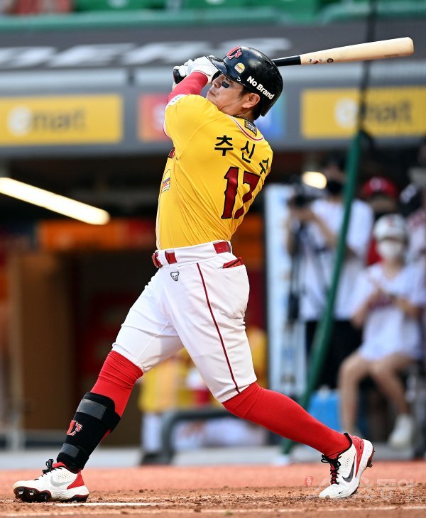 6일 인천 SSG 랜더스필드에서 ‘2022 신한은행 SOL KBO리그’ SSG 랜더스와 롯데 자이언츠의 경기가 열렸다. 3회말 2사에서 SSG 추신수가 솔로 홈런을 쏘아 올리고 있다.