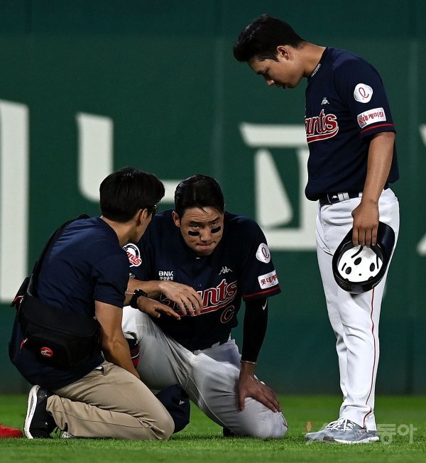 6일 인천 SSG 랜더스필드에서 ‘2022 신한은행 SOL KBO리그’ SSG 랜더스와 롯데 자이언츠의 경기가 열렸다. 6회말 무사 1, 2루에서 롯데 전준우가 무더위에 어지러움을 호소하고 있다.